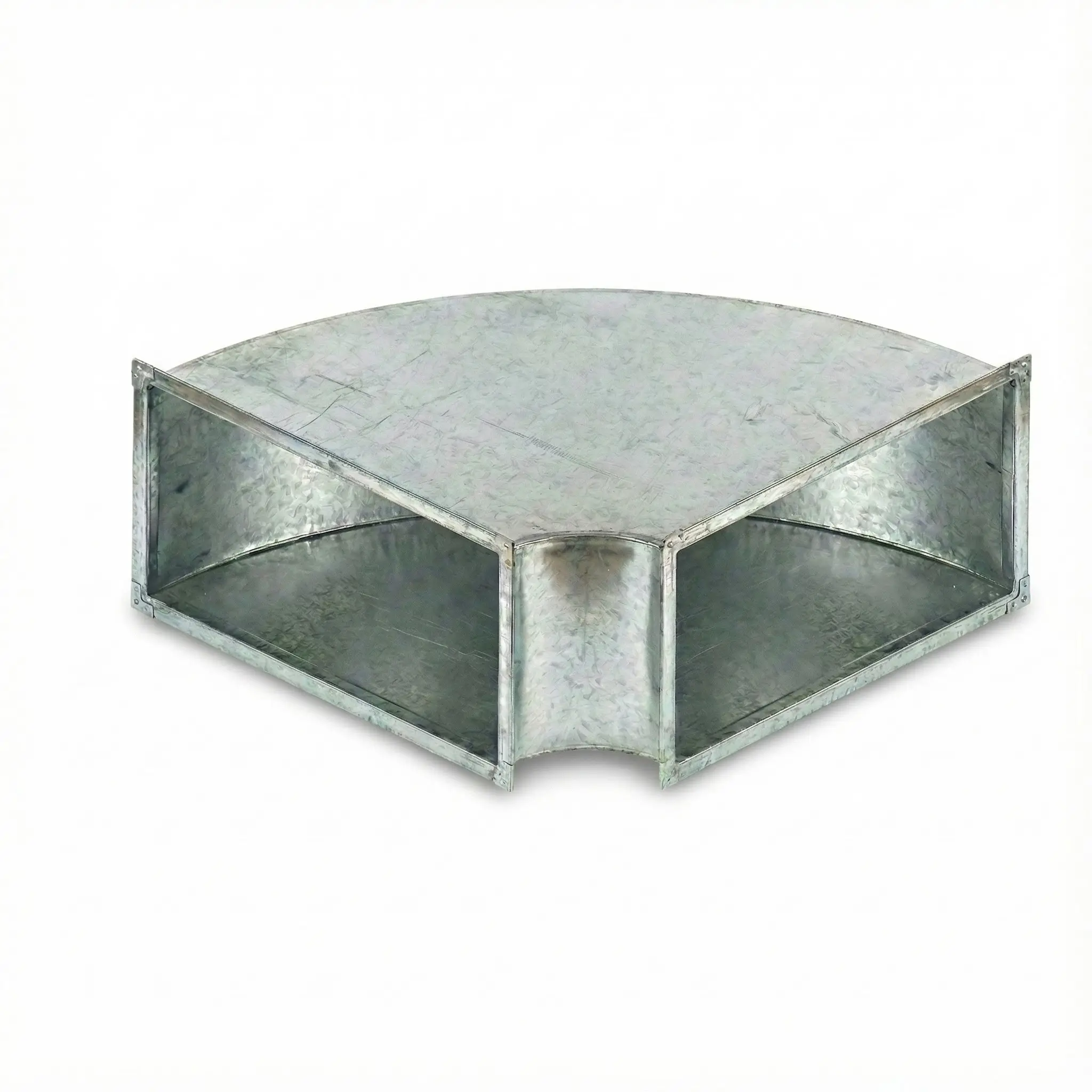 Отводы изготавливаются из оцинкованной стали по ГОСТ 14918-2020. Толщина металла подбирается в зависимости от размеров сечения и требований проекта и может составлять 0,5; 0,7; 0,9 или 1,0 мм. Конструкция включает две боковые стенки, наружную сторону и внутреннюю шейку, выполненную с плавным радиусом. На торцах устанавливаются фланцы для болтового соединения с прямыми участками воздуховода.